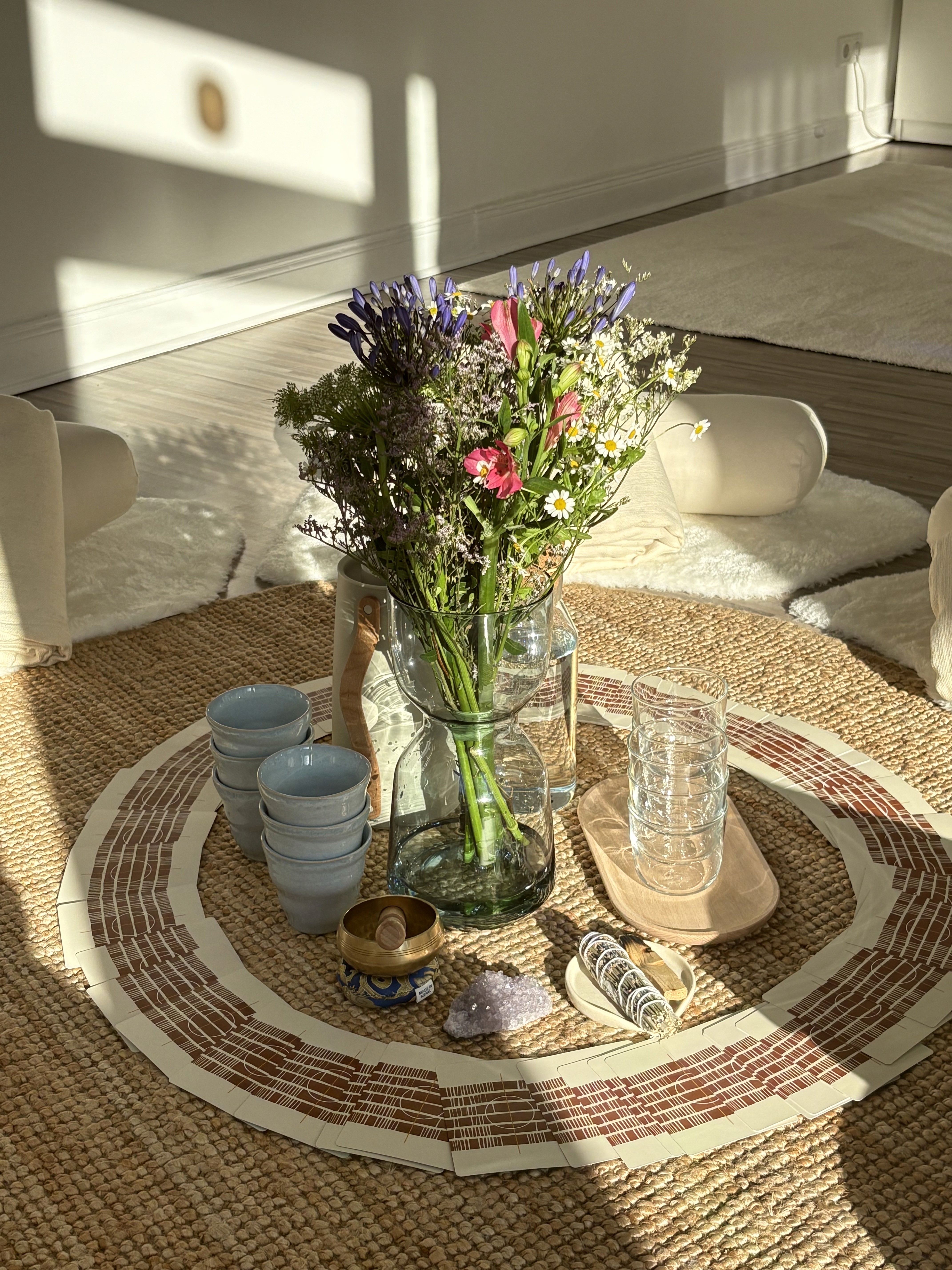 Geschützter Rahmen für Meditationsgruppen, Cacao Ceremonies oder Gesprächskreise. Flexibel auf dem Boden oder mit Stühlen.